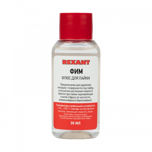 Флюс для пайки ФИМ 30 мл Rexant предназначен для удаления оксидов с поверхности под пайку, улучшения растекания жидкого припоя при пайке нержавеющих сталей и бронз (в частности алюминиевых и бериллиевых). Изготовлен бесканифольный флюс на основе ортофосфорной кислоты и лучше всего подходит для пайки нержавеющих сталей и нихрома, в остальном аналогичен паяльной кислоте. Данный низкотемпературный флюс применяется при пайке деталей или поверхностей припоями оловянно-свинцовой группы в температурном диапазоне 290-350℃. После пайки смыть остатки соединения водой.