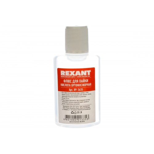 Флюс для пайки кислота ортофосфорная 30 мл Rexant предназначен для удаления оксидов с поверхности под пайку, улучшения растекания жидкого припоя при пайке по окисленной меди, по чёрному металлу или нержавеющей стали.