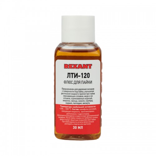 Флюс для пайки ЛТИ-120 30 мл Rexant предназначен для удаления оксидов с поверхности под пайку, улучшения растекания жидкого припоя и защиты от действия окружающей среды при пайке нержавеющих сплавов, меди и её сплавов, оцинкованных изделий, нихрома, свинца, никеля, серебра, кадмия, палладия, висмута. Данный низкотемпературный флюс применяется при пайке деталей или поверхностей припоями оловянно-свинцовой группы в температурном диапазоне 200-300℃. После пайки смывка не требуется, более того, остатки флюса служат защитным покрытием мест пайки. При необходимости его возможно растворить спиртом или ацетоном.
