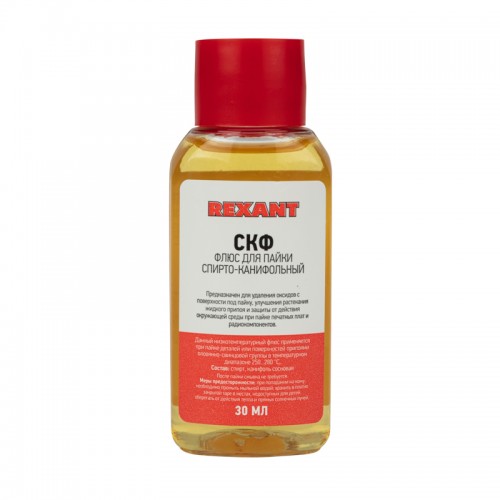 Флюс для пайки СКФ 30 мл Rexant предназначен для удаления оксидов с поверхности под пайку, улучшения растекания жидкого припоя и защиты от действия окружающей среды при пайке печатных плат и радиокомпонентов.