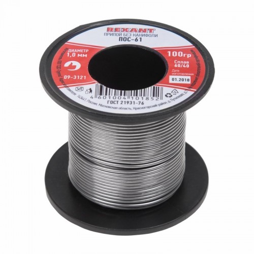 Расходные материалы,Припой Припой без канифоли ПОС-61 Rexant, катушка, 100 г, 1 мм 09-3121