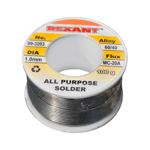 Припой с канифолью 100 г Rexant представляет собой проволоку (диаметром 1 мм) из сплава олова (60%) и свинца (40%). Используется в пайке для соединения деталей между собой и позволяет создать герметичный, механически прочный (устойчивый) шов. Нагреваясь до температуры плавления (183-188 С) припой: расплавляется, смачивает спаиваемый металл и, растекаясь по нему - заполняет место между соединяемыми деталями.