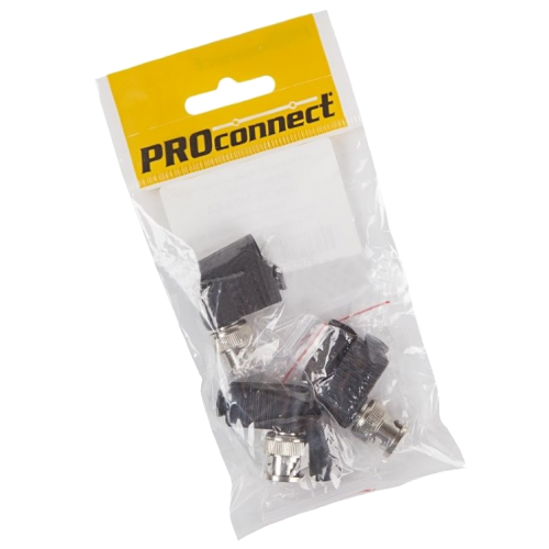 Разъем BNC(штекер) под винт с колпачком Proconnect, угловой, 3 шт/упак предназначен для подключения коаксиального кабеля c волновым сопротивлением 50 и 75 Ом, диаметром до 7мм, к видеокамерам, видеорегистраторам, мониторам и другим радиоэлектронным устройствам.