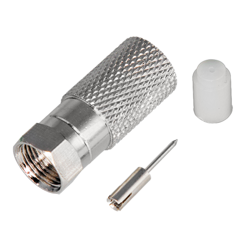 F-коннектор изготовлен из никелированного сплава меди (биметалл). Разъем устанавливается на кабель методом накрутки гильзы разъема на внешнюю оболочку кабеля, после соответствующей зачистки контактов, и не требует применения каких-либо специальных инструментов. Для перехода с жилы кабеля RG-11 на стандартный размер штекера используется специальная вставка (пин). F-штекер выступает в роли своеобразного экрана за счет накручивания на оплетку кабеля для выполнения роли электрического контакта.