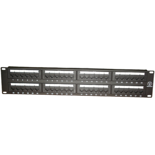 Патч-Панель 19" RIPO, 48 гнезд RJ-45, 2U, CAT5e, неэкранированная, черная. Внешне патч-панель представляет собой блок розеток с лицевой стороны, и соответствующее количество портов с контактами для фиксированной заделки кабеля. Розетки и контакты портов соединены между собой электрически. На лицевой части патч-панели расположены розетки, имеющие цифровую маркировку, а также дополнительные пустые площадки для пометок, необходимых при коммутации. Контакты, расположенные на обратной стороне патч-панели также имеют цифровую и цветовую маркировку.