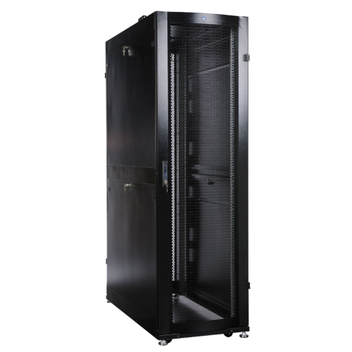 Конструкция шкафа оптимизирована для легкой установки серверного оборудования и поддержания максимального воздушного потока. Для организации линейной установки предусмотрено удобное крепление шкафов между собой. Перфорированные двери имеют округлую форму, что увеличивает площадь перфорации. Вертикальные направляющие имеют упрощенную регулировку по глубине. Основание шкафа полое. Вертикальные кабельные органайзеры входят в стандартную комплектацию шкафа, предусмотрена возможность вертикальной установки четырех 19’’ блоков розеток на каждый органайзер, возможна установка блоков розеток на горизонтальные соединительные швеллеры и вертикальные (юнитовые) направляющие. Шкаф поставляется в собранном виде на поддоне высотой 150мм. Цвет (порошковая покраска с предварительным фосфатированием) – RAL 9005 черный.