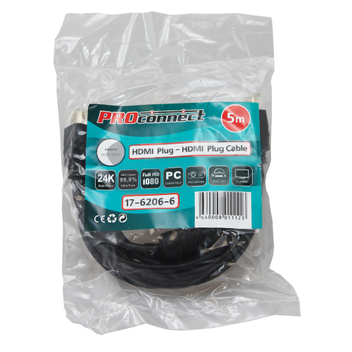 Шнур HDMI - HDMI GOLD Proconnect, с фильтром, 5 м предназначен для передачи цифровых видеоданных высокого разрешения и многоканальных цифровых аудиосигналов с защитой от копирования. Используется для подключения во многих устройствах нового поколения: телевизионных аппаратах, компьютерах и ноутбуках, мультимедийных проигрывателях, игровых консолях, видеокамерах и других видеоустройствах имеющих соответствующий разъём.