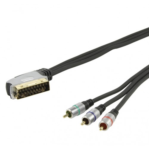 Шнур SCART - 3 RCA Component PRO-class Rexant, премиум, 1.5 м предназначен для качественной передачи видео и аудиосигнала между устройствами (телевизор, видеомагнитофон, DVD-проигрыватель), имеющими разъемы типа SCART и RCA. Соединительный шнур с одной стороны имеет штекер SCART-разъема (европейский стандарт для подключения мультимедийного оборудования) и с другой три штекера разъема RCA. Длина шнура составляет 1.5 метра.